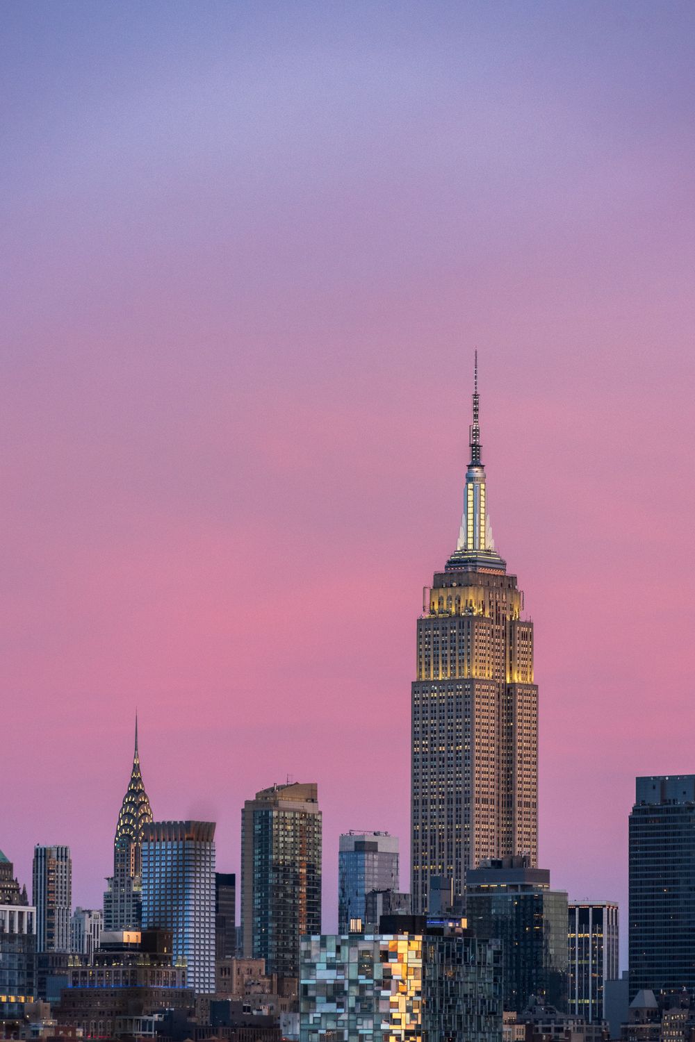 The Empire State Building rises above Midtown Manhattan as the sky shifts from blue to pink at sunset. Completed in 1931, the Art Deco tower has long served as a visual anchor for the city.